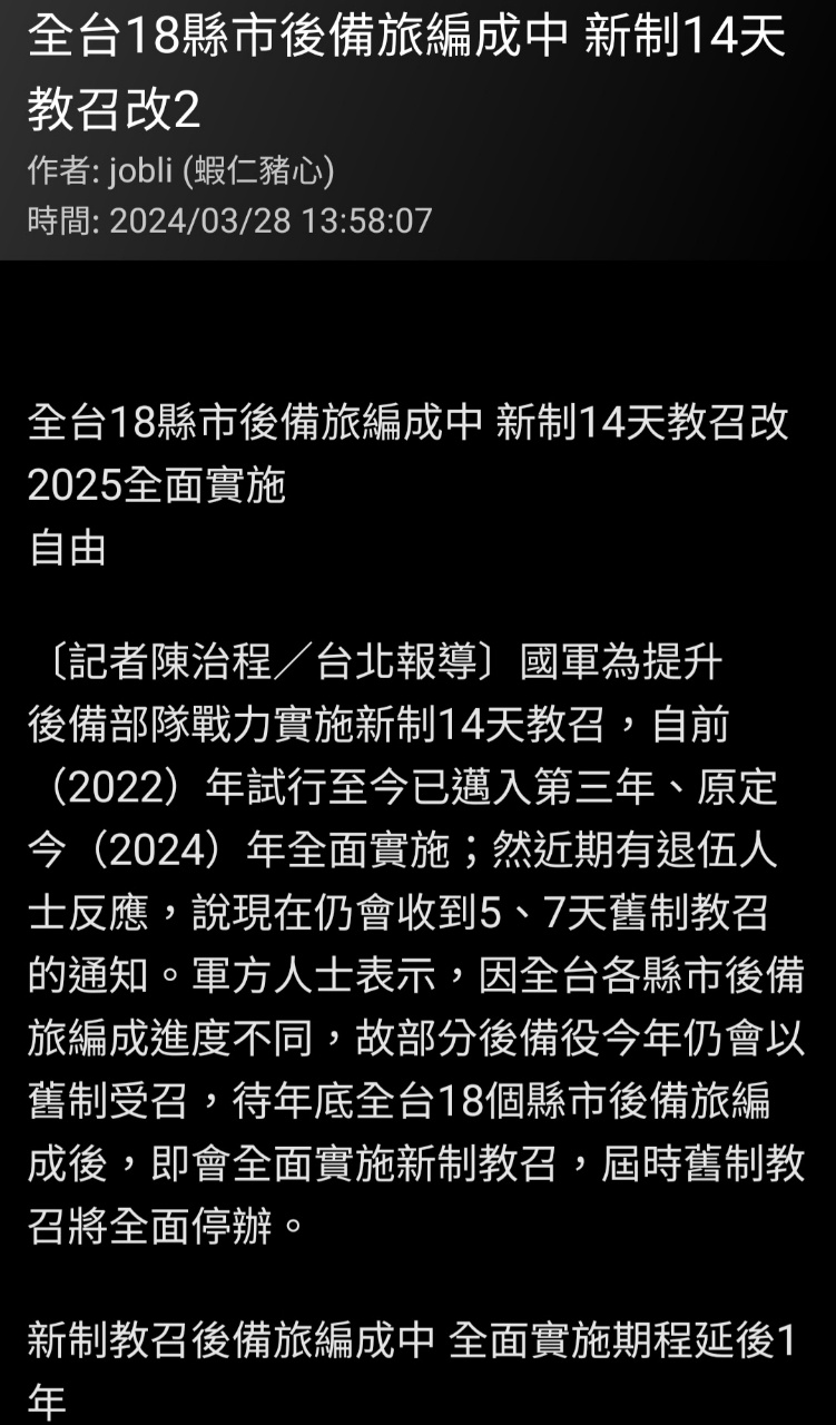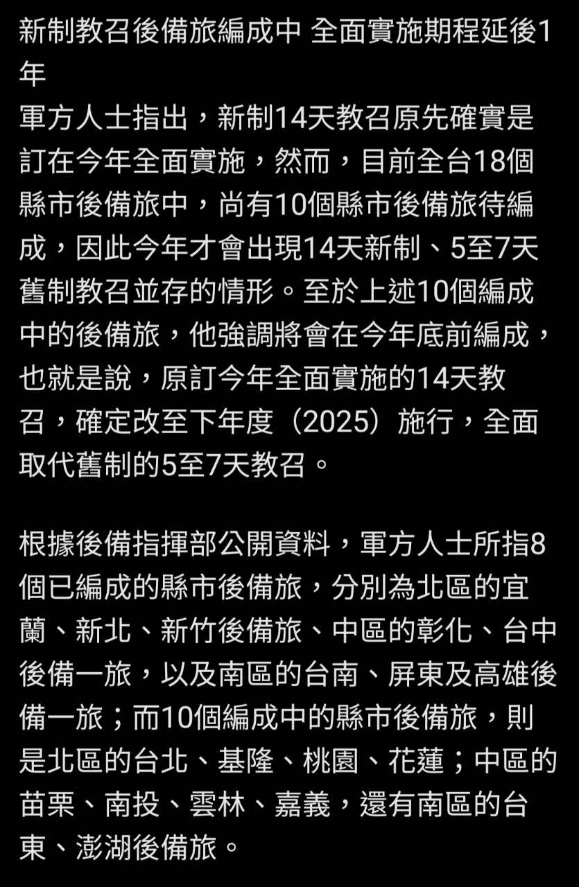 → ja23072008 : 內容都寫2025全面推行14天教召,要增加教召人數得 11/04 22:51