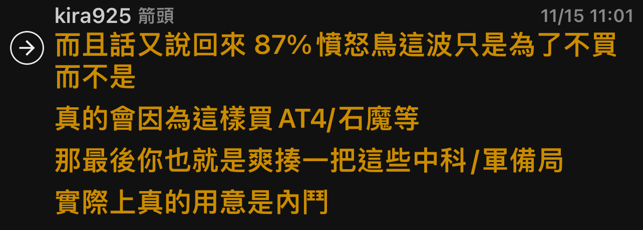 → whitertiger : 動風向的好機會,可以讓網友對國造武器沒信心,讓以 11/15 10:54