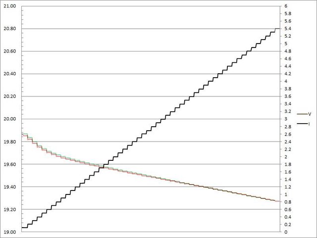 ▼USB-C1(紅)/USB-C2(綠)搭配5A線材的PPS檔20V輸出負載測試,隨著電流增加,輸出電