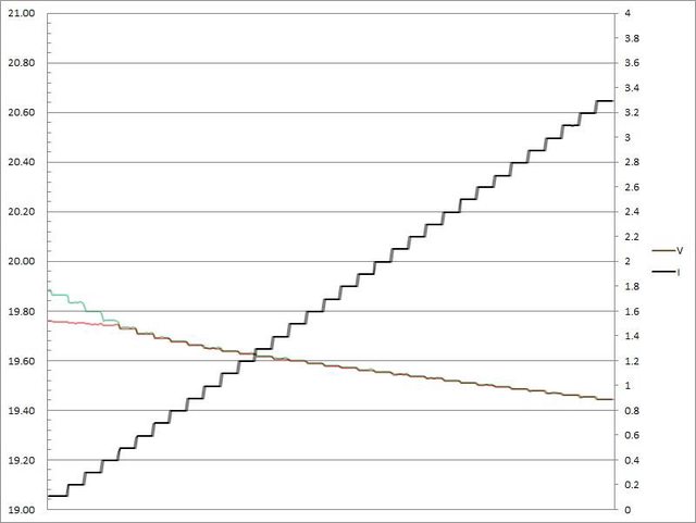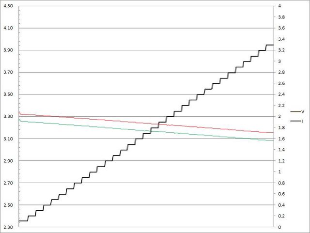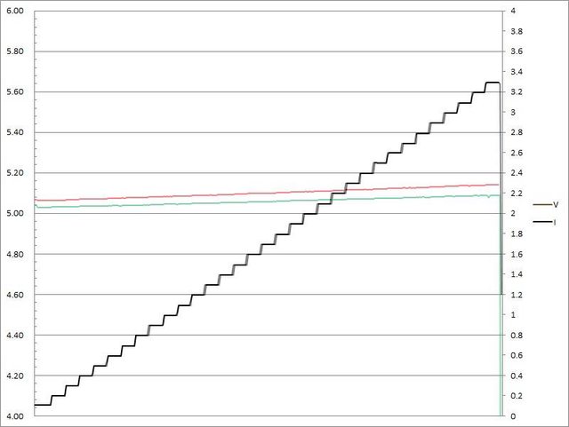 ▼USB-C1(紅)/USB-C2(綠)搭配5A線材的PPS檔3.3V輸出負載測試,隨著電流增加,輸出電