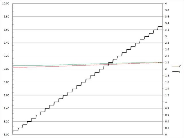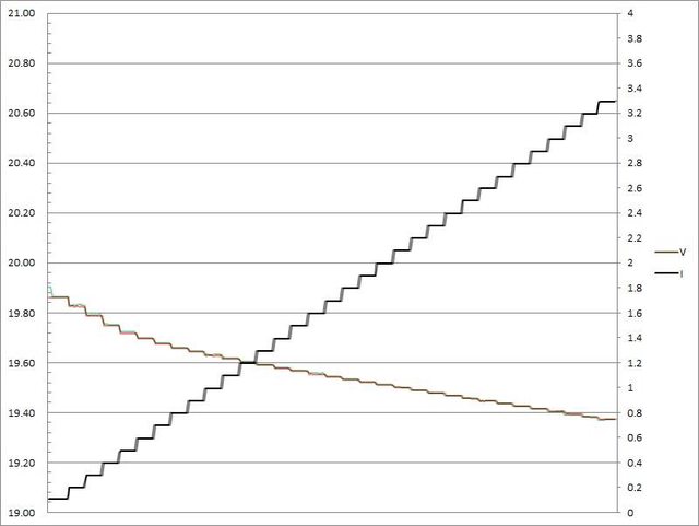 ▼DC插座輸出負載測試,隨著電流增加,輸出電壓下降,輸出電流超過9.6A截止(圖表只
