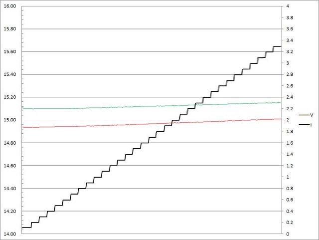 ▼USB-C1(紅)/USB-C2(綠)搭配5A線材的固定檔15V輸出負載測試,隨著電流增加,輸出電