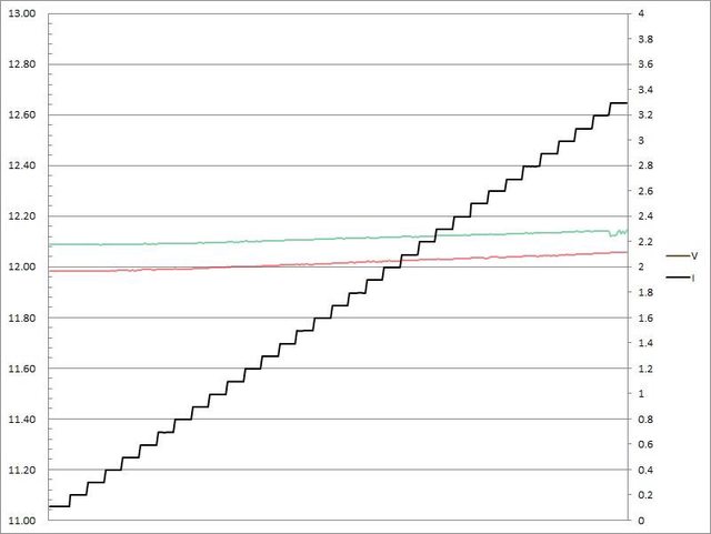 ▼USB-C1(紅)/USB-C2(綠)搭配5A線材的固定檔12V輸出負載測試,隨著電流增加,輸出電