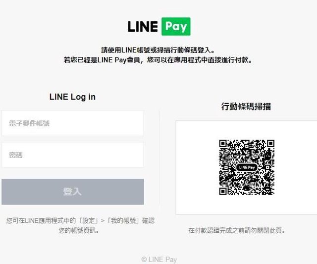 B1-5.頁面4,進入LINE支付頁面,請登錄LINE或拿起你的手機掃行動條碼 QR Code。
