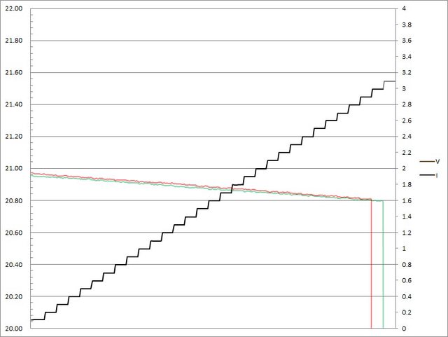 ▼C1(紅)/C2(綠)搭配5A線材的PPS檔21V輸出負載測試,隨著電流增加,輸出電壓下降,