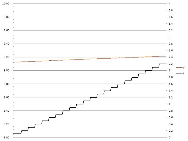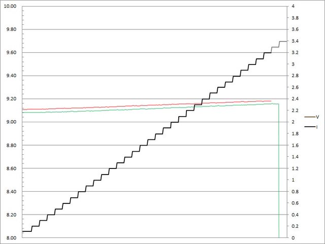 ▼C1(紅)/C2(綠)搭配5A線材的固定檔9V輸出負載測試,隨著電流增加,輸出電壓上升,