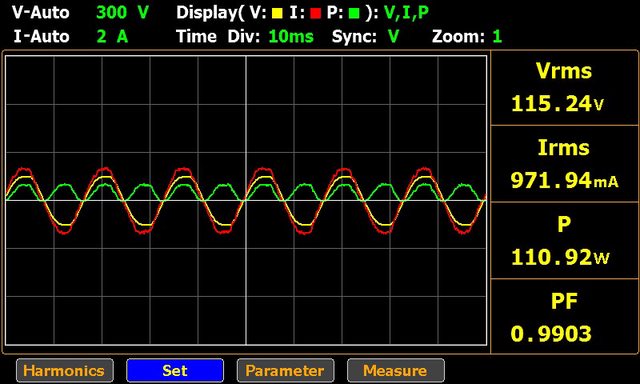 ▼C1輸出100W的交流輸入電壓/電流/功率波形如下圖所示,此時功率因數0.9903