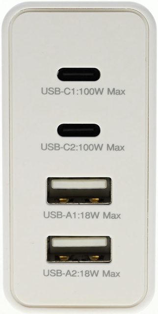 ●具備2個USB-C及2個USB-A輸出,自動偵測主流快充協議,C1/C2最大單埠輸出100W,