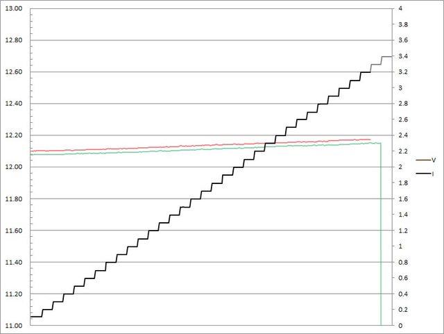▼C1(紅)/C2(綠)搭配5A線材的固定檔12V輸出負載測試,隨著電流增加,輸出電壓上升,