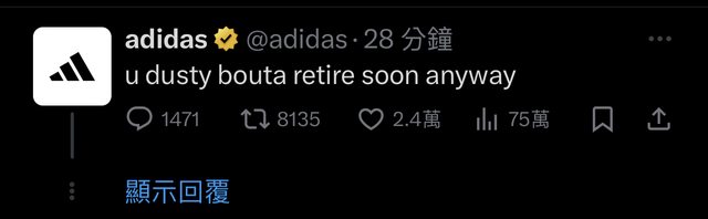 → hanslins : 原本愛迪達的回應很突兀,小帳號梗就很好笑 12/02 10:41