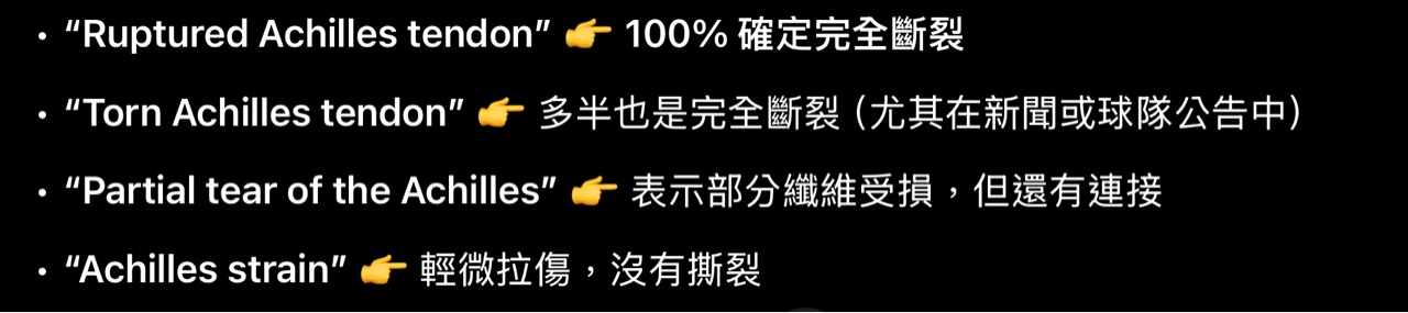 → k960674 : 查了幾篇文,阿基里斯腱不像ACL還有可能部分撕裂, 06/24 01:51