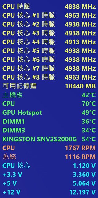 搭配 7800X3D 體驗相當順暢平均運行時脈 4.9-5G 電壓 1.120v