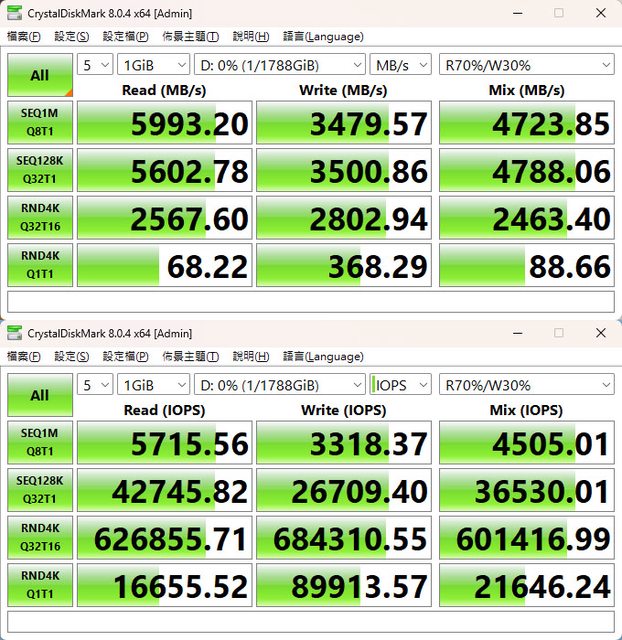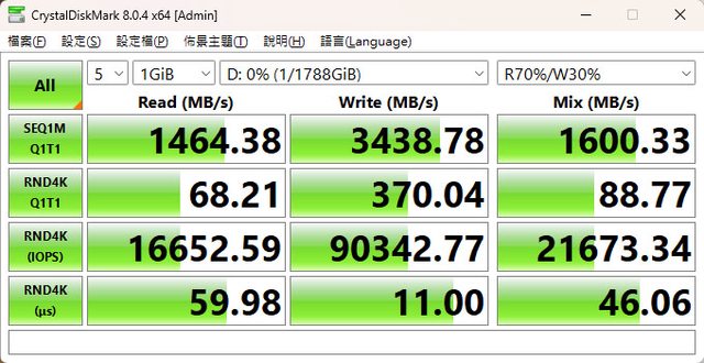 (NVMe)+Mix(R70%/W30%)傳輸速度測試