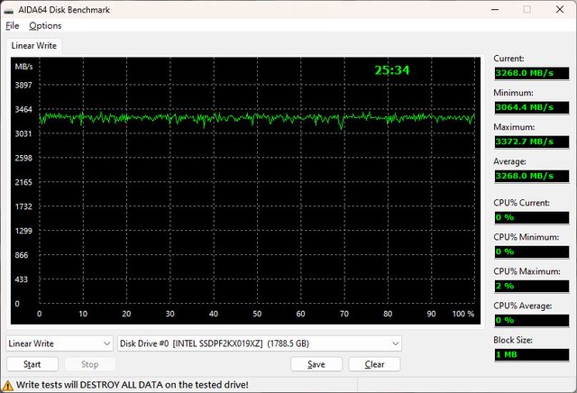 寫入測試,最高速度3,372.7MB/s,最低速度3,064.4MB/s,中途未出現降速