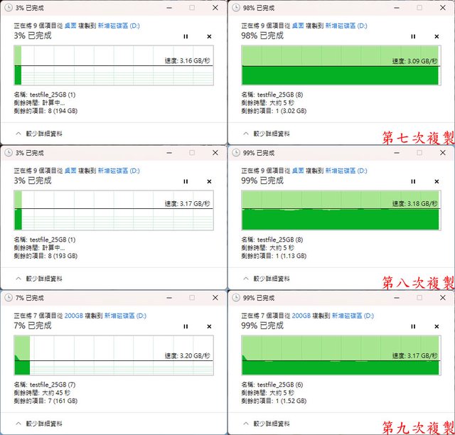 ▼第7至9次寫入狀況如下圖,均維持在3.09至3.2GB/s的速度