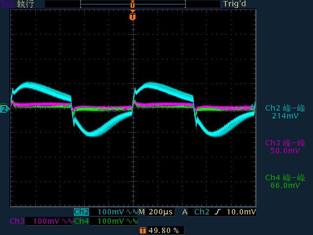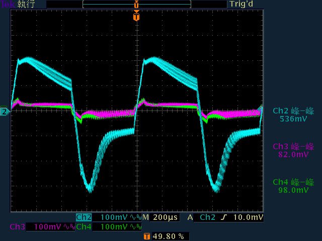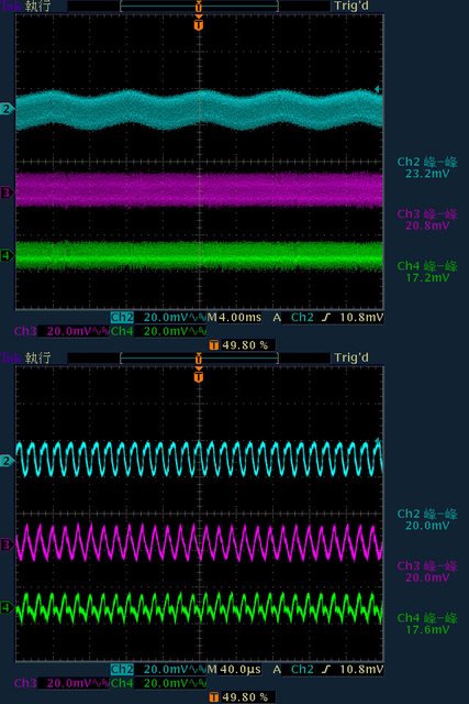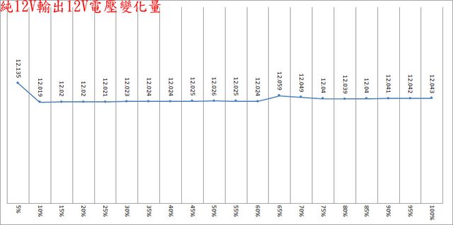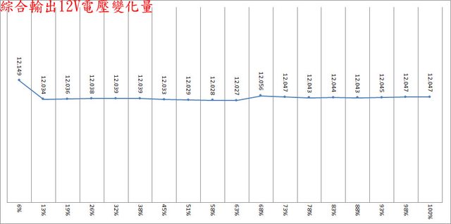 12V漣波波形固定,只改變振幅。於綜合全負載輸出下12V/5V/3.3V各路低頻漣波分別為