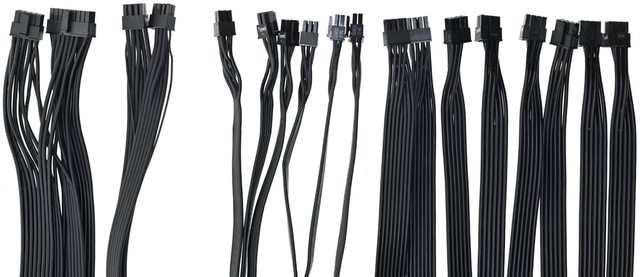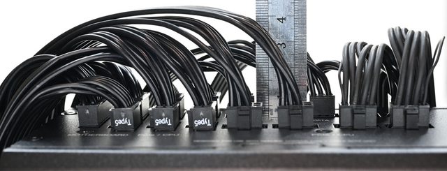 ▼6條顯示卡電源黑色帶狀模組化線路,提供8個PCIE 6+2P接頭,4條為單接頭配置,線路