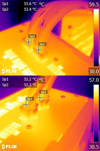 ▼單條PCIE 6+2P(雙頭)連續輸出21A(252W)10分鐘後的電源端模組化接頭紅外線熱影像圖