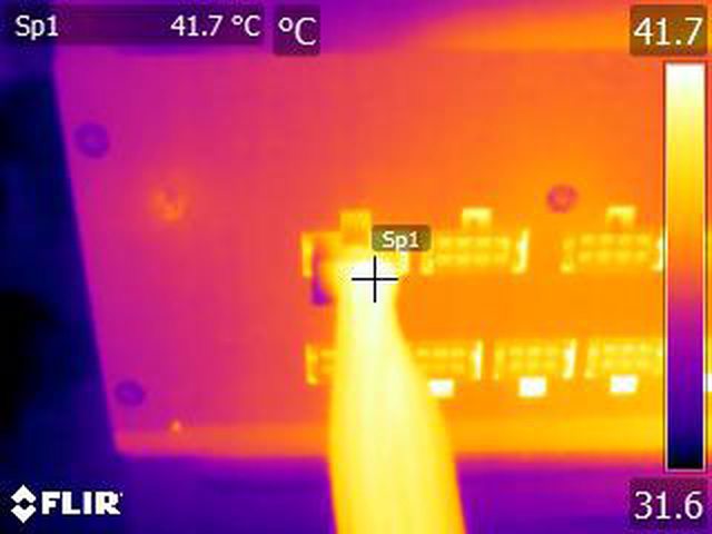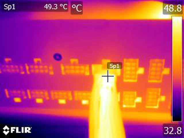 ▼執行FURMARK 30分鐘後,顯示卡端插頭的紅外線熱影像圖(附註:安裝位置環境溫度會