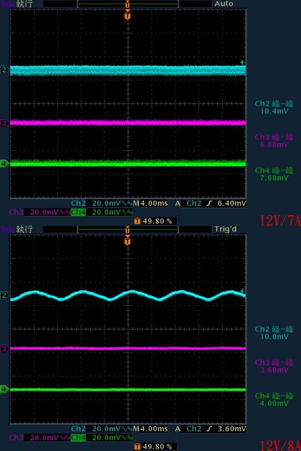 ○輸出無負載時12V有鋸齒狀漣波;輸出12V/1A至7A時12V漣波頻率增加;輸出12V/8A以上