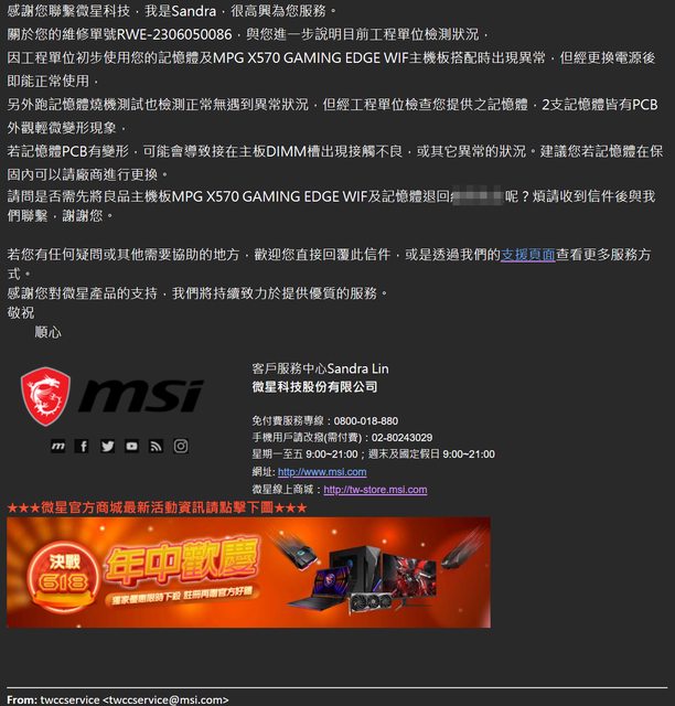 [17:10] Msi Agent: 了解,故您此次送修是有附回您的記憶體,但工程師未用您的記憶