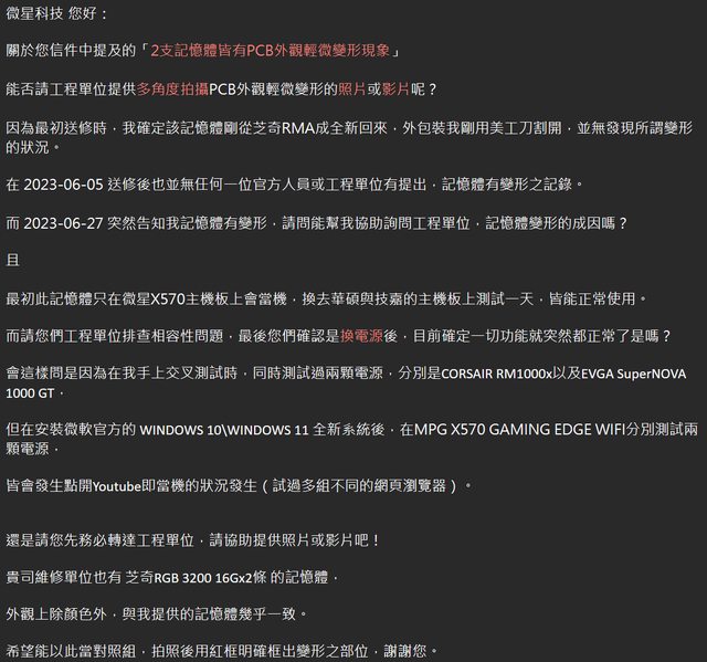而是選擇在 2023-06-27 才突然來信說都測過沒問題了,但你記憶體有變形?