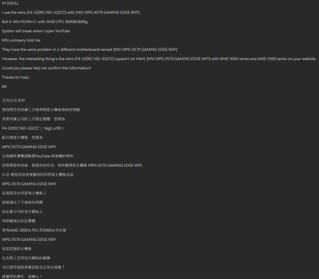 [17:06] 我: 第二次送修主機板時,我將全新送修回來的芝奇記憶體(芝奇更換全新)一