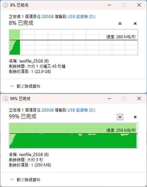 ▼從系統碟拉1個25GB檔案寫入記憶卡,維持在259至260MB/s的速度,中後段速度略有波