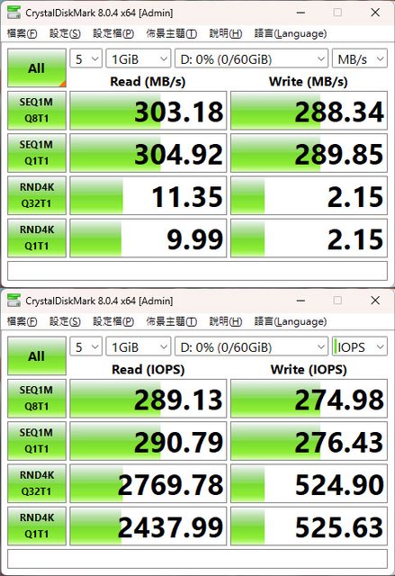 Q1T1均可達規格所標示讀取300MB/s(305MB/s)及寫入260MB/s(289MB/s)的性能。搭配