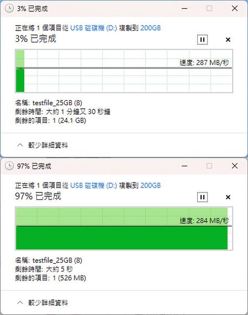 ▼從記憶卡拉1個25GB檔案寫入系統碟,維持在284至287MB/s的速度