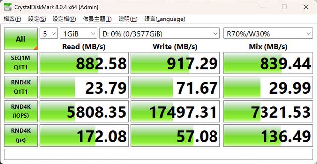 ▼CrystalDiskMark預設+R70%/W30% Mix測試結果