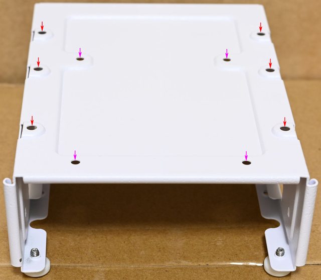 ▼3.5吋/2.5吋固定架頂部有3.5吋硬碟(紅色箭頭)及2.5吋SSD(紫色箭頭)固定孔