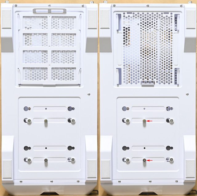 ▼底板前端增設E-ATX主機板用鎖點(紅色箭頭),不過E-ATX主機板會阻擋到底板前方穿線