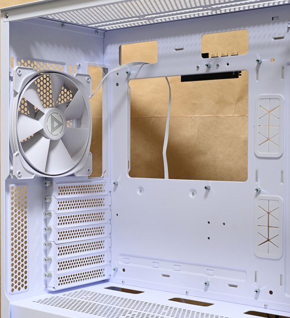 ▼機殼後方右上長條形固定孔可安裝1個120/140mm風扇。提供7個無支架標準擴充槽,均