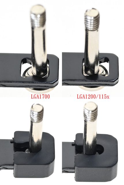 三角形凸面的邊朝沙漏型開孔內側裝(右上),為對應LGA1200/115x平台使用。確認螺柱底