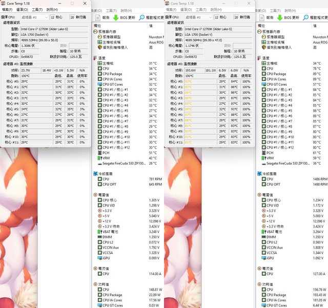 ▼待機(左)及高負載(右)的CORE TEMP及AIDA64感測器畫面