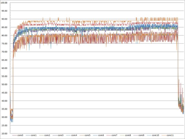 ▼高負載30分鐘CORE TEMP溫度記錄圖