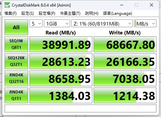 讀取 38991.89MB/s 寫入 688667.80B/s