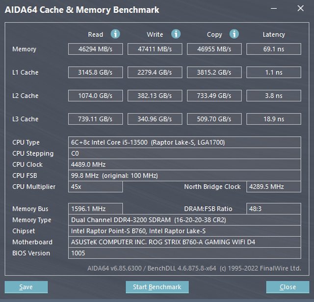 讀取 46294MB/s 寫入 47411MB/s Copy 46955MB/s 延遲69.1