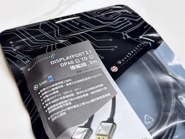 首先是Displayport 2.1線材,包裝上標示了DP 2.1及DP40等規格,表示其為符合DP 2.1