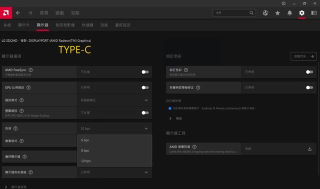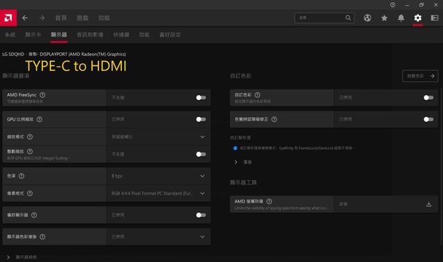 使用TYPE-C轉HDMI轉換器則會被辨認為DP輸入,但奇怪的是依然只有8bpc色深,照理說這