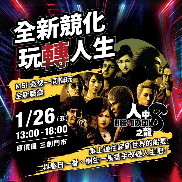 慶祝合作,MSI與SEGA將於2024年1月26日下午一點至六點,在原價屋三創旗艦店舉辦『全新競化 玩轉人生 』體驗會。現場將由電競女神依渟帶領玩家搶先體驗華麗的RPG戰鬥。參與活動並購買MSI Z790主機板的玩家不僅可獲得《人中之龍8》PC數位版(Steam)免費下載序號,還有機會獲得Vigor GK30 COMBO電競鍵盤滑鼠組、《人中之龍8》紀念馬克杯等精美好禮。