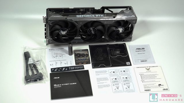 配件包括 16-PIN 轉接線材 (3 個 8-PIN)、顯示卡支撐器、TUF GAMING 卡牌、紙製手機支
