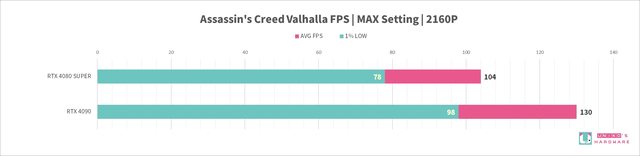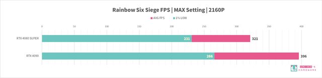 RTX 4080 SUPER 針對遊戲性能對比 RTX 4090,在 4k 2160P 解析度下,平均 FPS -22%,1