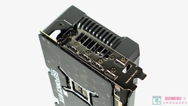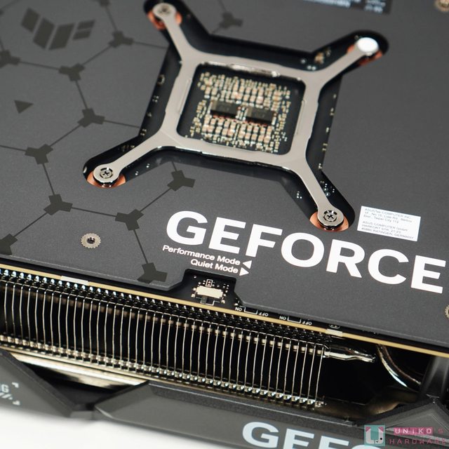 金屬背板上有大大的 GEFORCE RTX 字樣,還有一些 TUF GAMING 的 LOGO,右邊碩大的開孔