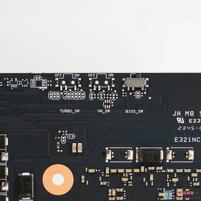雙 BIOS 切換位於靠近左側的 PCB 頂部,兩檔控制分別為 PERFORMANCE MODE (P-MODE) 和