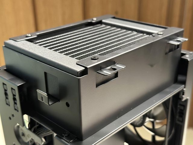 顯示卡與主機板為背對背安裝方式,各自從面板開孔進氣後,從頂部CPU一體水冷及側邊