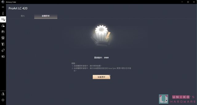使用者可以直接在 Armoury Crate 進行韌體和驅動程式的更新,以確保系統運行在更佳的 功能和完整度。 注意:在韌體更新過程中,請勿移除裝置,也不要在裝置燈效設定或 Aura Sync 頁面中更 改任何燈效。 https://i.imgur.com/6mhhEUg.jpg