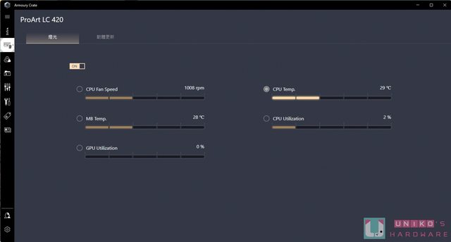 使用者可以透過 Armoury Crate 設定要監控的硬體資訊,包括 CPU 風扇轉速、CPU 或主機 板溫度,以及 CPU 和 GPU 的使用率。 使用者能夠選擇監控其中一種硬體狀態,實現指示燈浮動的即時顯示,以便快速了解系統運 作狀態。 https://i.imgur.com/s4pVNYU.jpg