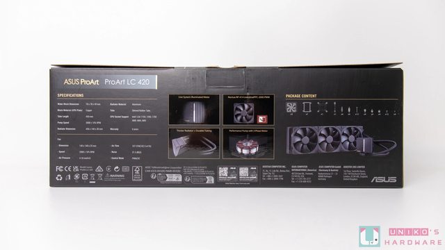 ProArt 是 ASUS 旗下針對全球頂尖創意工作者推出的一個系列,融合了專業與藝術的理念 ,透過簡約風格呈現。 該系列產品目前已推出筆電、桌上型電腦、顯示卡、主機板、機殼、一體式水冷散熱器和顯 示器等,都能明顯感受到其優雅的美感,以及與電競取向產品大不同的設計理念。 此次開箱的是 ProArt LC 420 一體式水冷散熱器,專業度從選用 420 mm 的大尺寸冷排搭 配貓扇,就能感受到華碩對 ProArt 系列的用料絕不手軟,實際表現如何?就讓我們一起看 下去。 ProArt LC 420 包裝和配件 包裝盒採用長方形盒裝設計,整體以全黑背景為主,搭配金色的 ProArt 品牌視覺文字設計 ,展現一種低調中帶點華麗的質感。 正面右側印有品牌和產品名稱,上面也以圖標的形式簡單呈現產品特點,有支援 Intel LGA 1700、AMD AM5 腳位、採用 Noctua 風扇和 6 年產品有限保固。 背面左側列出產品規格,中間呈現 ProArt LC 420 四大特點 - 可即時顯示系統狀態的發光 儀表、配備 Noctua NF-A14 industrialPPC-2000 PWM 散熱風扇、30 mm 厚度冷排與編 織網強化水冷管,右側則是包裝內產品本體與配件的圖文簡介。 https://i.imgur.com/1DEnqXY.jpg